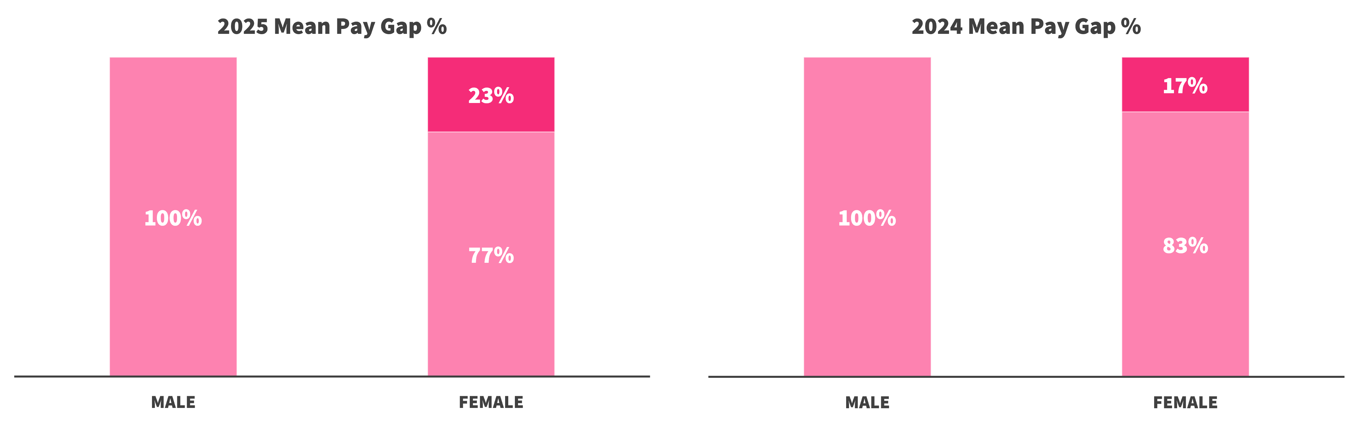The mean hourly pay gap has widened in 2025 compared to the previous year. Women now earn £0.77 for every £1 earned by men, down from £0.83 last year. This reflects a larger difference in average hourly pay between men and women across the company.