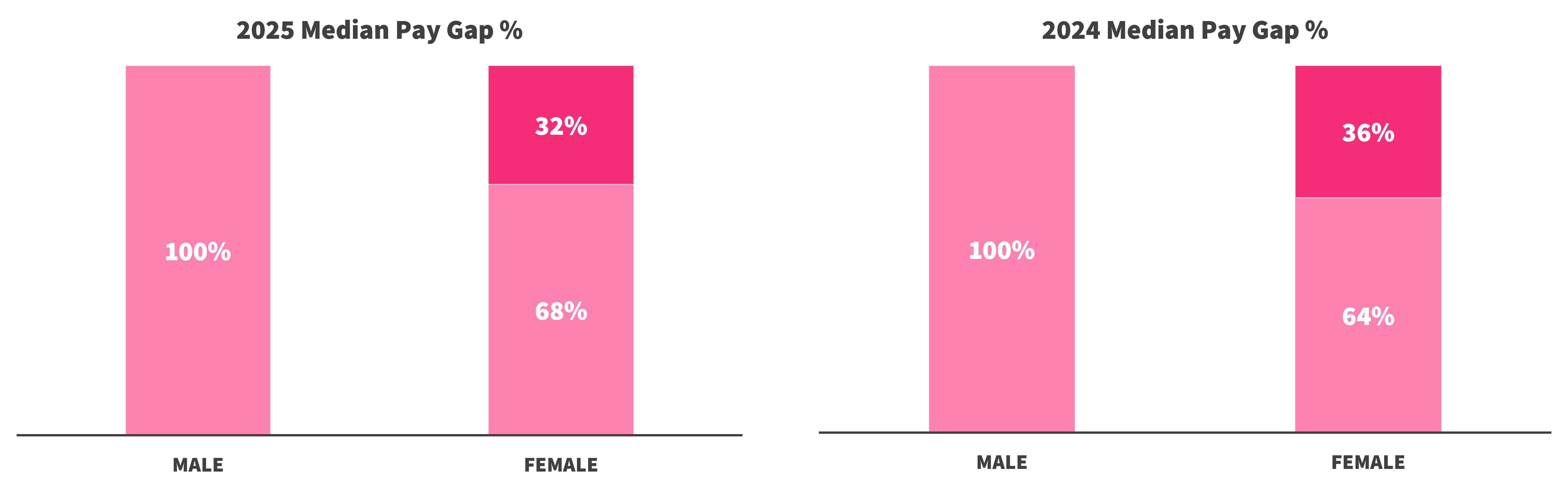 The median hourly pay gap, which compares the midpoint hourly rate for female employees with the midpoint hourly rate for male employees, has narrowed from 36 percent to 32 percent. While this represents an improvement, the gap remains substantial and highlights ongoing pay disparity at the middle of the pay distribution.