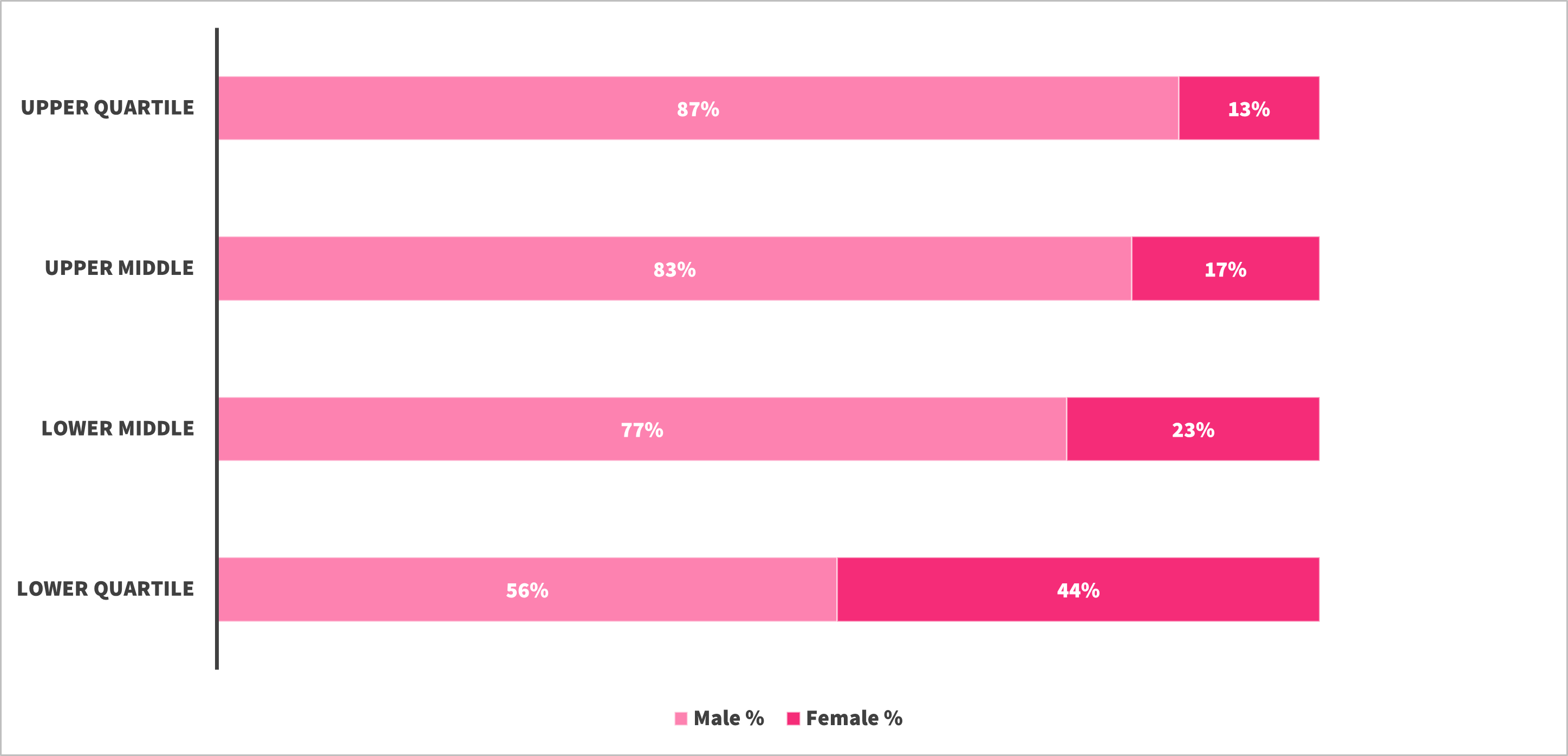 Quartiles are calculated by listing all employees from lowest to highest and then splitting the list into four equal sized groups and then calculating the percentage of men and women in these groups.
